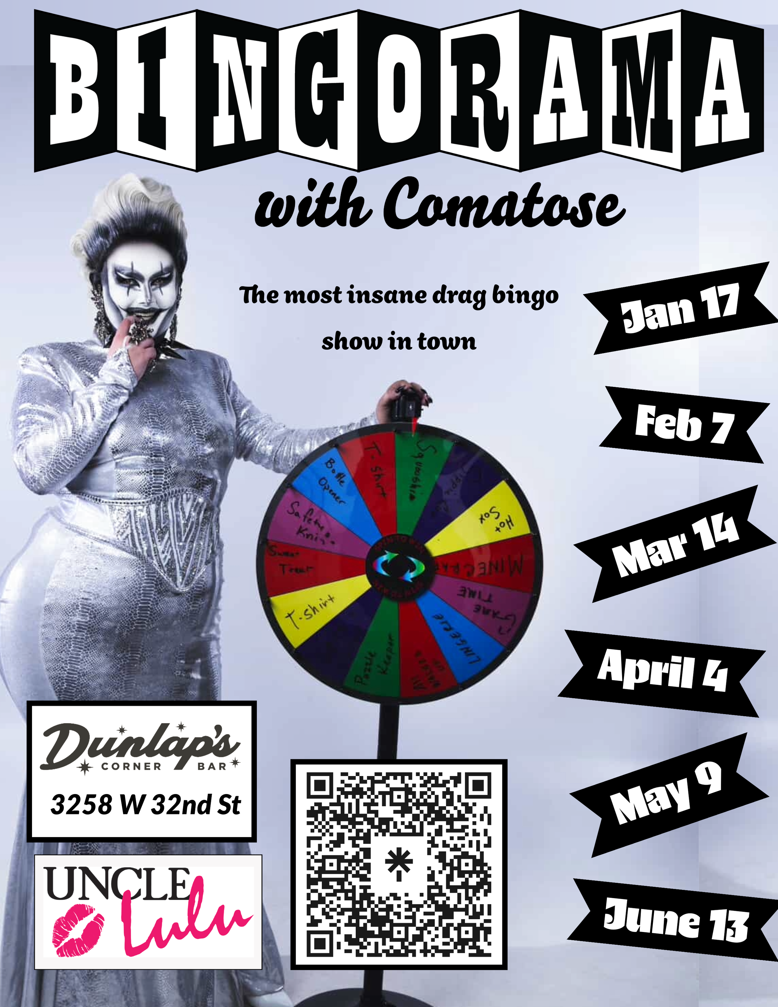 We’ll do 6 rounds of our Bingorama style bingo, have a couple rounds of drag numbers, and a lot of fun. Our home is Dunlap’s Corner Bar. Located at 3258 W 32nd St, just south of Ohio City. This kitchy bar has the best bartenders and free popcorn!
